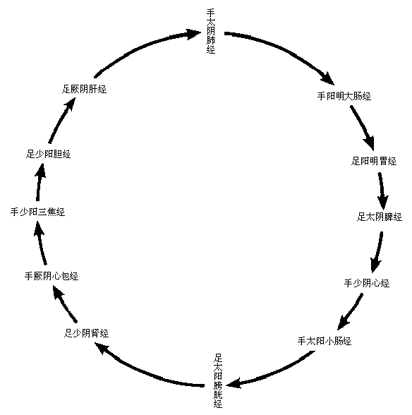 正如前述,經(jīng)絡中氣血的流通是機體生存的根本基礎。而經(jīng)脈是運行氣血的經(jīng)路,而氣血的運行是按一定的次序流注的,十二正經(jīng)脈的循環(huán)(大循環(huán))是從手太陰肺經(jīng)開始,一次傳至足厥陰肝經(jīng),再流注手太陰肺經(jīng),首尾相連,“陰陽想貫,如環(huán)無端”。