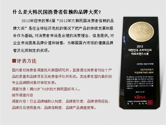 本次評選是通過全國的成年男女對產(chǎn)品的品質(zhì)、品牌的 信賴度、消費者評價、專業(yè)人員審核、針對(株)美健醫(yī)療 器的經(jīng)營策略、品牌實力、競爭力、企業(yè)形象、產(chǎn)品滿意度、信賴度、使用情況等多種審評條件中脫穎而出的最優(yōu)秀企業(yè) 才能獲獎,因而他的意義就非常重要了。